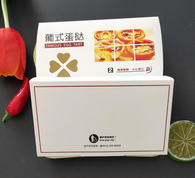 2. 纸板成型:将纸板按照蛋挞盒的设计图案切割成合适大小的板材,然后经过压制、摆放等工序,成型为蛋挞盒的外壳和盖子。